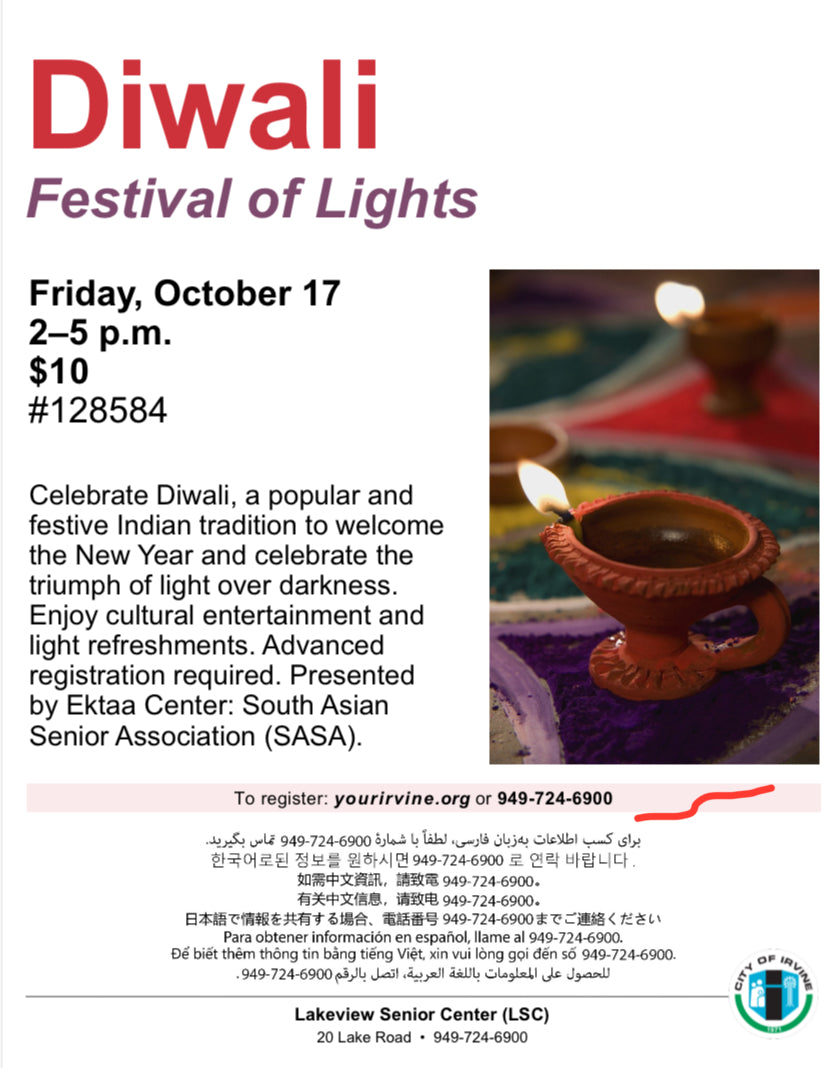 South Asian Senior Association (SASA) is hosting a Diwali celebration on Friday October 17th from 2pm-4pm in Irvine with music and dance! A few of our Academy students will be offering a beautiful Kathak performance for the senior community. Invite only