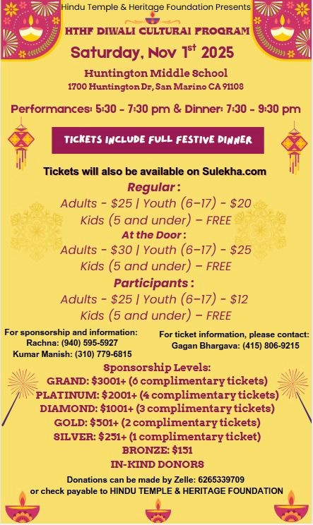 Location: Huntington Middle School: 1700 Huntington Dr, San Marino, CA 91108Tickets available on Sulekha.com (see flier), and dinner is included!