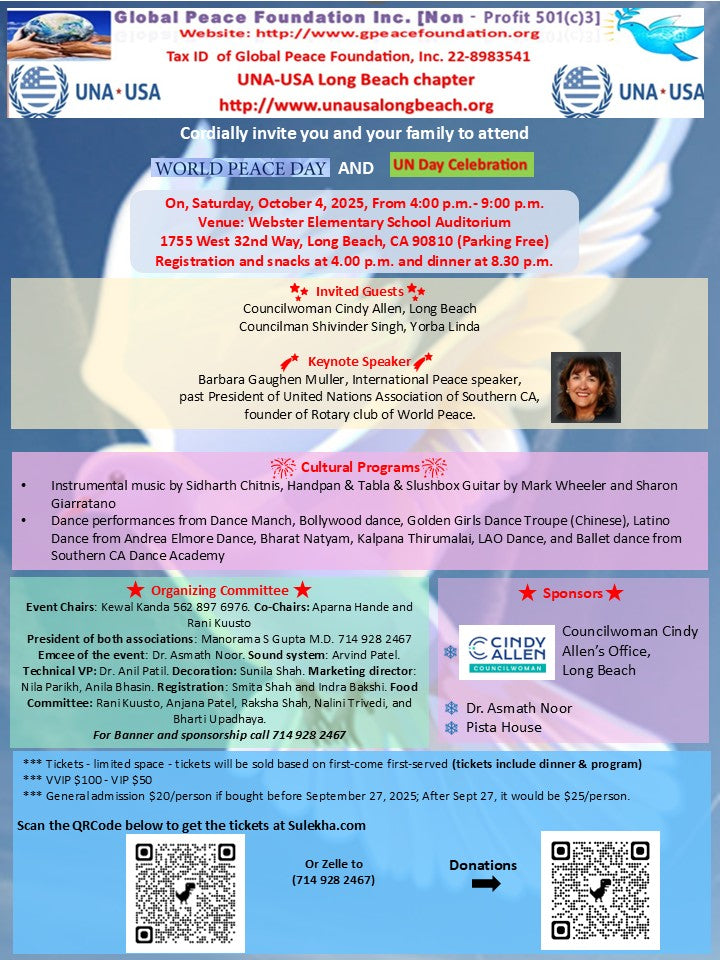 Young students from the academy will be performing at the UNA-USA Long Beach Chapter Global Peace Foundation World Peace Day event at Webster School auditorium in Long Beach. Ticket required, available at sulekha.com -